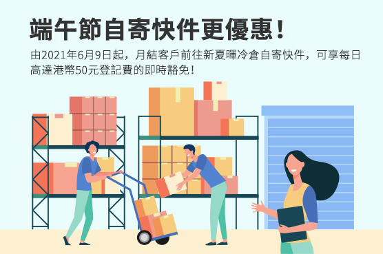 為回饋客戶對新夏暉的支持,由2021年6月8日起加推自寄優惠!於新夏暉冷倉(地址: 香港青衣青衣航運路36號亞洲物流中心 - 順豐大廈4樓)自寄的客戶可享高達每日港幣50元登記費的即時豁免。